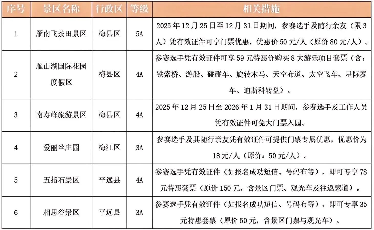 优惠力度:2025年12月25日至2026年1月31日期间,参赛选手及工作人员凭有效证件可免大门票入园。